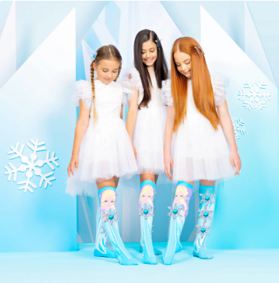 Embárcate en una aventura congelada junto a Elsa. Estas calcetas combinan brillos, copos de nieve y detalles que relucen, haciéndote sentir parte del reino de hielo. Perfectas para quienes saben todas las letras de Let It Go y quieren brillar con cada paso. 🏰🤍