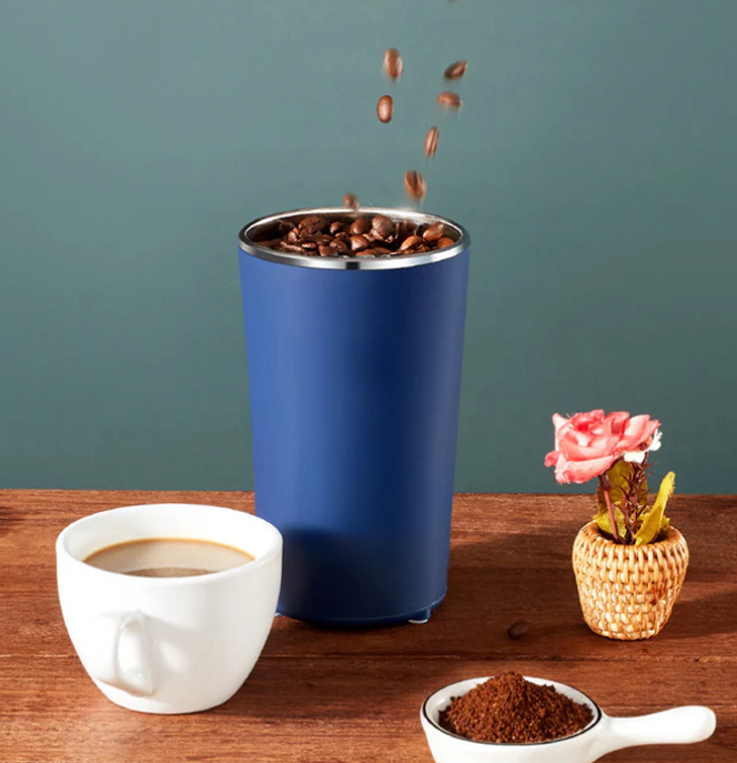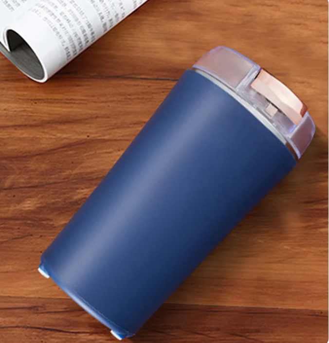 Con un potente motor y cuchillas de acero inoxidable, el Molinillo Eléctrico Portátil tritura granos, café, especias y más en cuestión de segundos.