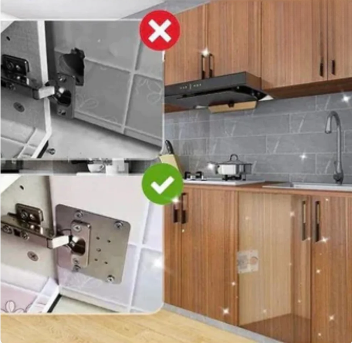 Ya sea en gabinetes de cocina, armarios, muebles de TV o estantes, esta placa se adapta perfectamente. Su diseño universal cubre el área dañada y se alinea con cualquier bisagra estándar. 🔧