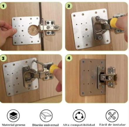 Esta placa metálica está diseñada para solucionar problemas de bisagras flojas, oxidadas o rotas, cubriendo el área dañada y permitiéndote atornillar nuevamente con firmeza.