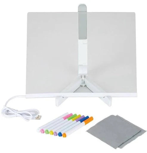 TABLERO DE MENSAJES ACRÍLICO LUMINOSO BORRABLE CON SOPORTE Y 7 BOLÍGRAFOS COLORIDOS